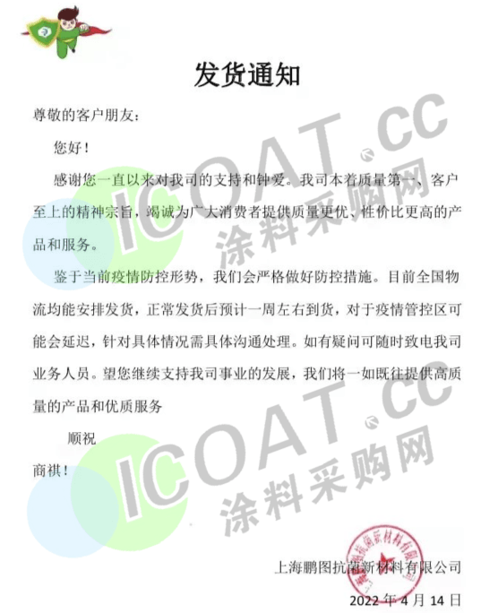 上海涂料企業鱷魚尼卡發布停產通知,表示在4月1日至5日浦西地區輪候封控期間將放假,因此可能會出現部分產品因為疫情管控短暫缺貨的現象,給經銷商帶來不便。目前上海疫情防控政策持續高壓,尚未獲知其是否已經恢復生產。