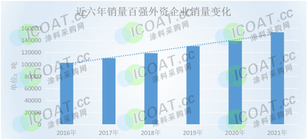 從內(nèi)外資結(jié)構(gòu)上來看,近六年外資企業(yè)主要是阿克蘇諾貝爾粉末涂料、老虎、佐敦、PPG、立邦、宣偉、艾仕得等企業(yè),并無其它外資企業(yè)進(jìn)入,但是從下圖來看,外資企業(yè)在國內(nèi)市場的粉末涂料銷售量呈現(xiàn)上漲態(tài)勢,在存量以至于減量市場之下,外資企業(yè)的市場份額在增大,就意味著民族企業(yè)的市場份額在下滑。據(jù)涂料采購網(wǎng)不完全統(tǒng)計(jì),2021年粉末涂料銷量百強(qiáng)企業(yè)中外資企業(yè)銷量同比增長10%。