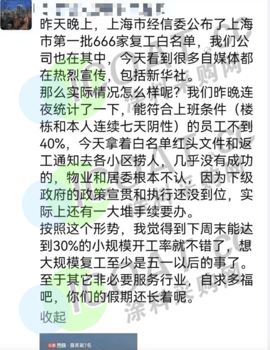 即便有政策保駕護航,企業(yè)人員“出不來”的情況依然存在。部分企業(yè)表示,白名單的復工政策與小區(qū)的封控政策有所沖突,部分小區(qū)并不認可白名單政策,只進不出的政策沒有優(yōu)先級,員工難以破解這種沖突,這進一步增加了員工到崗的難度。