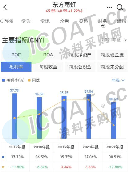 在凈利潤方面,艾仕得凈利潤16.799億,同比增長117.02%,中航新材1081萬,同比增長115.52%,飛凱材料3.86億,同比增長67.89%。值得注意的是,佐敦2021年凈利潤同比減少11.23%至22.1億,集泰股份同比減少54.64%至5068.9萬,奔騰股份同比減少83.67%至304.74萬。