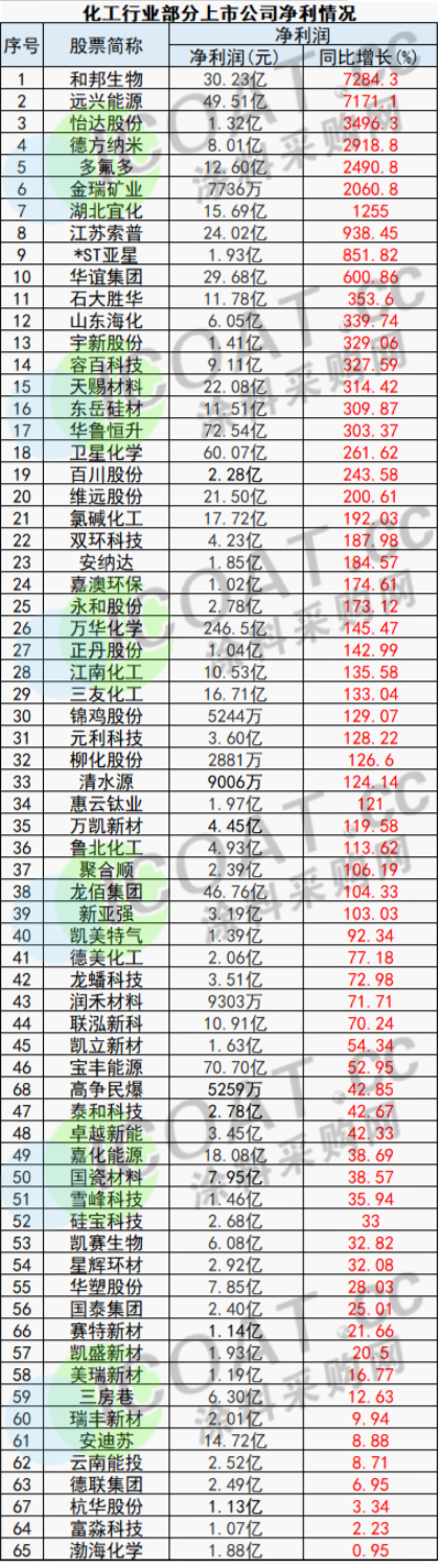 凈利潤方面,同比增長榜首為和邦生物(7284.3%),凈利潤同比增長72倍。而后是遠興能源(7171.1%)、怡達股份(3496.33%)、德方納米(2918.8%)、多氟多(2490.8%)、金瑞礦業(2060.8%)、湖北宜化(1255%),同比增長均超過10倍。江蘇索普、東岳硅材、安納達、維遠股份等32家企業凈利潤同比增長超100%。化工一哥萬華化學凈利潤246.5億,鈦白粉龍頭龍佰集團凈利潤46.76億元,化肥龍頭湖北宜化凈利潤15.69億元,鋰電池溶劑企業石大勝華凈利潤11.78億元。