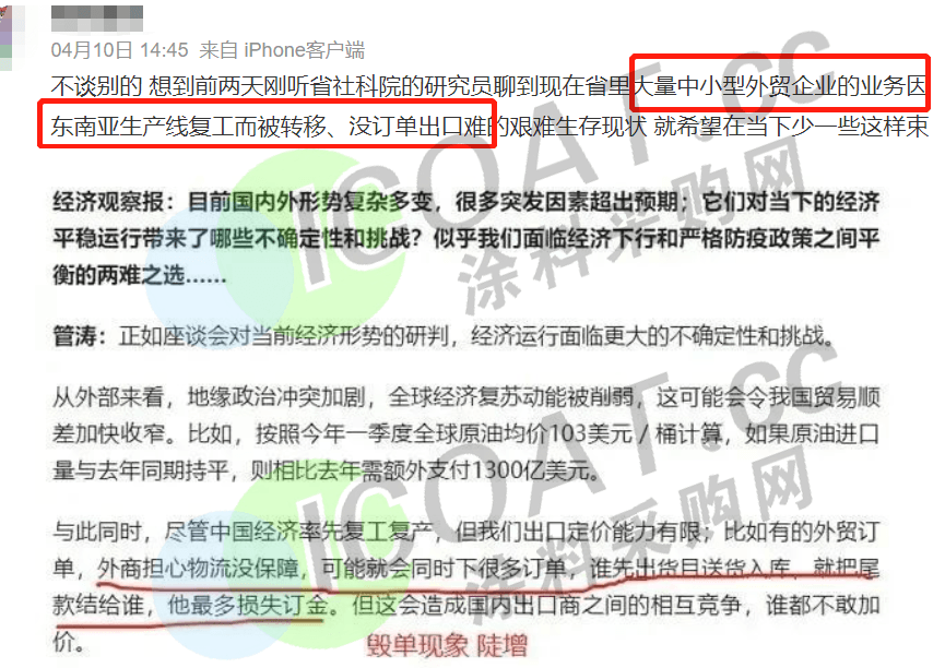 東南亞國復(fù)工復(fù)產(chǎn)中,越南表現(xiàn)最為突出。越南海關(guān)總局公布,越南貨物貿(mào)易一季度累計(jì)進(jìn)出口總額達(dá)1763.5億美元,同比增長14.4%(凈增221.7億美元),其中前兩個(gè)月越南貨物出口金額達(dá)537.9億美元,較2021年同期增長10.2%。據(jù)了解,當(dāng)?shù)卦S多紡織企業(yè)訂單甚至已排到今年第三季。有網(wǎng)友感受頗深,表示大量外貿(mào)企業(yè)的訂單被轉(zhuǎn)移甚至沒訂單了……