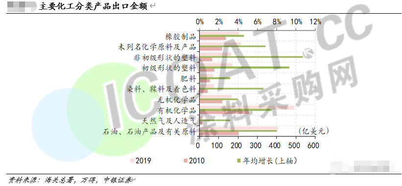 外貿(mào)行業(yè)的“熄火”對于化工產(chǎn)業(yè)而言是致命的。根據(jù)海關(guān)總署的數(shù)據(jù),從2010-2019年,我國化工分類產(chǎn)品的出口金額持續(xù)增長,塑料類的產(chǎn)品增速最快,年均增速接近10%。從規(guī)模來看,有機(jī)化學(xué)品以及石油、石油產(chǎn)品及有關(guān)原料兩個(gè)分類的出口金額規(guī)模最大。
