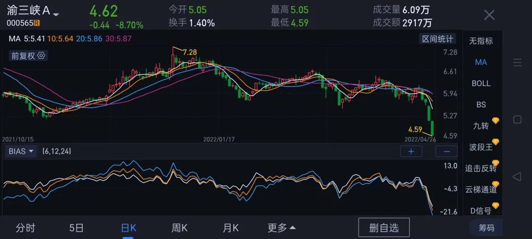 渝三峽A股價下跌1.03元,跌幅16.91%,市值蒸發4.5億元;