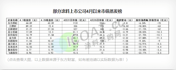 據涂料采購網不完全統計,4月初至25日,11家涂料上市公司出現了股價下跌的情況,其中三棵樹股價下跌16.82元,比科順股份、凱倫股份、金力泰等多家涂料上市公司25日股價還要高。而在以上11家涂料行業上市公司中,東方雨虹、三棵樹、北新建材市值蒸發超過50億,其中東方雨虹以70億元的“優勢”位列市值蒸發榜榜首,70多億的縮水量比凱倫股份、亞士創能和金力泰的目前的市值還要高,相當于3個渝三峽、集泰股份,4個東來技術,5個飛鹿股份的身價,涂料板塊市值蒸發合計258.7億元。