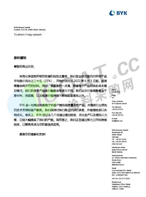 畢克化學(xué):自6月1日起,在全球范圍內(nèi)對(duì)公司所有產(chǎn)品進(jìn)行不同程度的調(diào)漲,平均漲價(jià)25%。