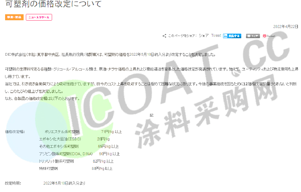 DIC:5月10日起,上調(diào)各種增塑劑的價(jià)格,最高漲上漲4420元/噸。