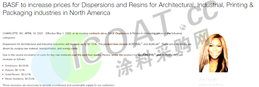 巴斯夫:自5月1日起,提高分散體和樹(shù)脂價(jià)格,乳液上調(diào)0.05美元/磅(約706元/噸),多元醇上調(diào)0.12美元/磅(1695元/噸),固體樹(shù)脂上調(diào)0.07美元/磅(989元/噸),樹(shù)脂溶液上調(diào)0.03美元/磅(424元/噸)。