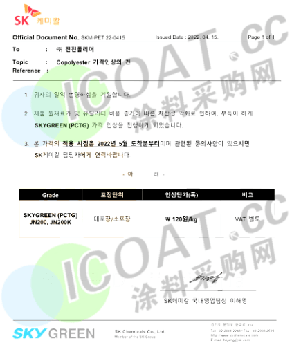 SK化學(xué):自5月開(kāi)始,將提高PCTG 韓國(guó)SK JN200/JN200K產(chǎn)品售價(jià),上調(diào)120韓元/kg(約合人民幣622元/噸)。
