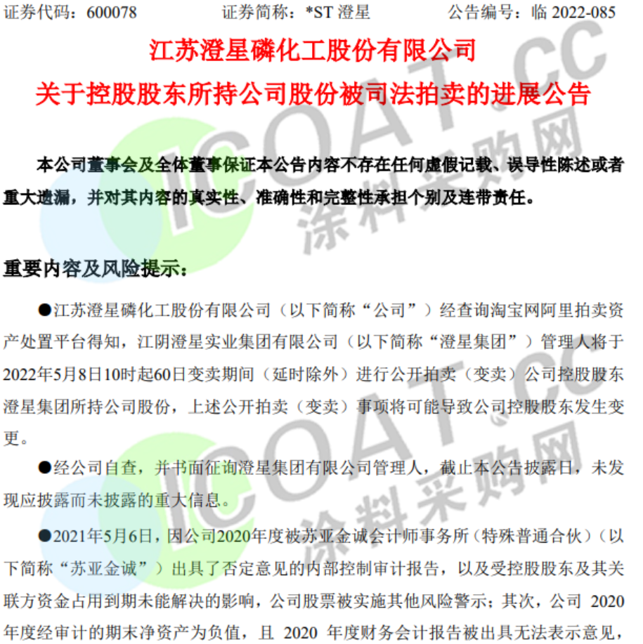 近日,江蘇澄星磷化工發布關于控股股東所持公司股份被司法拍賣的進展公告,稱經查詢淘寶網阿里拍賣資產處置平臺得知,澄星集團管理人將于 2022年5月8日10時起60日變賣期間(延時除外)進行公開拍賣(變賣)公司控股股東澄星集團所持公司股份,上述公開拍賣(變賣)事項將可能導致公司控股股東發生變更。