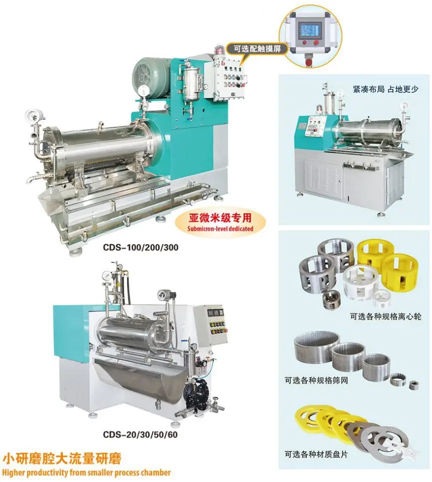 在亞微米級專用領域,不同于傳統砂磨設備低效、難以更換材質的體驗,通惠裝備全新打造的CDS大流量砂磨機,采用新研發功能部件,其中高效率的研磨盤片和超大離心輪及篩網,使研磨珠子能更好的分布在研磨腔并安全分離。利用離心動態分離式篩網提高流量,大大地提高了研磨分散的效率。因其容易更換產品易磨損的備件的特點,可以適合于高磨損的產品。