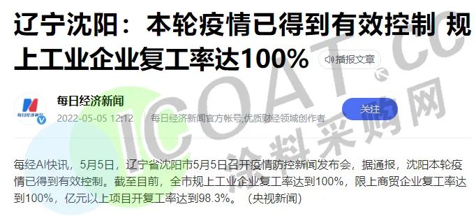 沈陽化工:目前已符合沈陽市政府相關疫情防控規(guī)定的要求,并于2022年4月14日開始有序復工復產。
