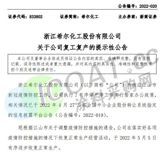 浙江希爾化工:在落實好各項疫情防控措施的情況下恢復正常生產經營活動,于2022年5月5日有序逐步恢復正常生產。