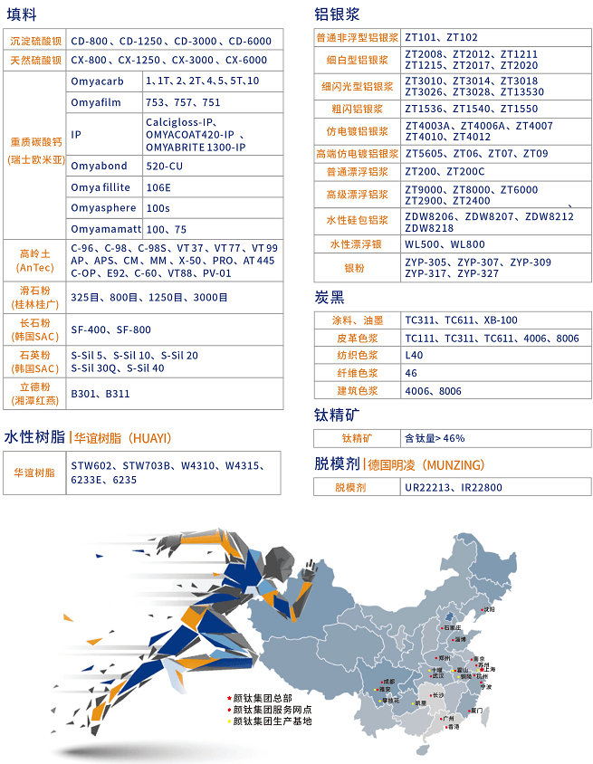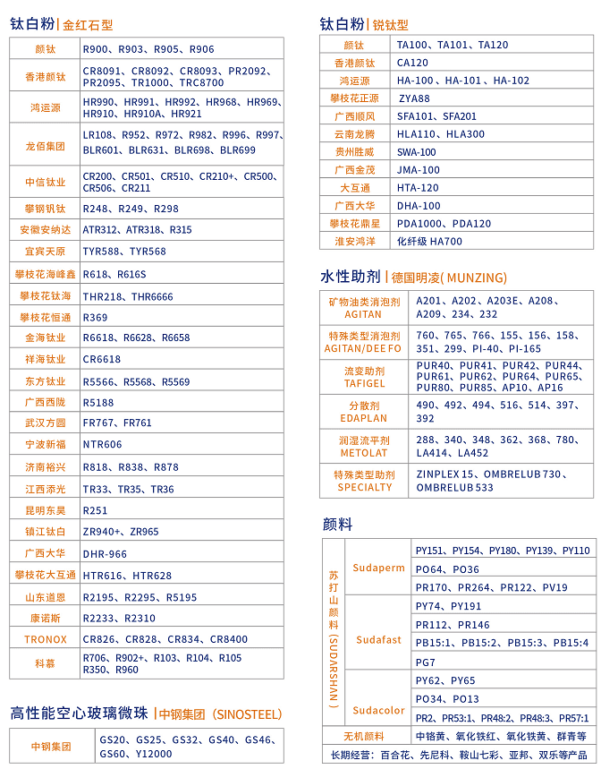 另外,顏鈦配套代理經(jīng)營印度蘇達(dá)山(Sudarshan)酞菁藍(lán)、酞菁綠等有機(jī)顏料;德國明凌(MÜNZING)分散劑、消泡劑、增稠劑、潤濕流平劑、蠟助劑等助劑;瑞士歐米亞(OMYA)碳酸鈣,以及超細(xì)天然硫酸鋇、沉淀硫酸鋇、高性能空心玻璃微珠、水性樹脂等2000多種產(chǎn)品,已經(jīng)成為一家工貿(mào)結(jié)合的優(yōu)質(zhì)化工原材料供應(yīng)商。