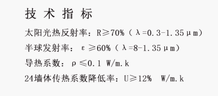 該產(chǎn)品采用國際通用的光學(xué)、熱傳導(dǎo)學(xué)原理和技術(shù)指標(biāo)進行產(chǎn)品的功能檢測評定,有效保障產(chǎn)品質(zhì)量的可靠和穩(wěn)定。經(jīng)權(quán)威機構(gòu)檢測后可知,產(chǎn)品涂層的高太陽熱反射率、低太陽熱吸收率可使墻表面溫度有效降低10-15℃,減少空調(diào)開啟次數(shù),節(jié)省電耗,達到節(jié)能減排的目的和效果。