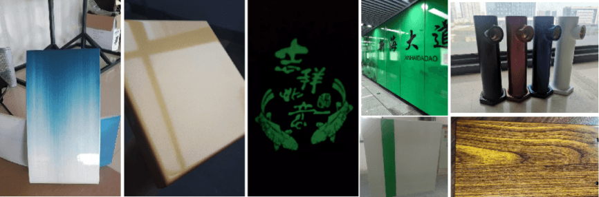 柔性陶瓷水漆的外觀也十分豐富,可以根據(jù)要求制備出各種實色漆、珠光漆、鋁粉漆,撒點、磨砂、夜光等效果,也可與印刷技術結合制備更炫麗的圖案效果。