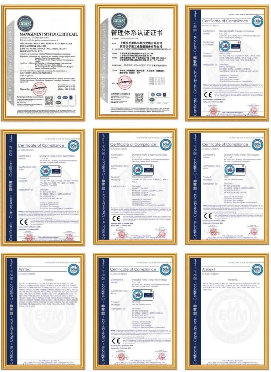 作為擁有近二十年研發經驗的精細化工設備的優質供應商,法孚萊2010年通過ISO9001-2008質量管理體系認證,攪拌設備、分散設備、高剪切乳化設備、濕法研磨設備、粉體混合設備及各種反應釜等所有產品從設計,生產,采購,組裝,試車,檢驗到最終入庫完全按照質量管理體系的要求落實到位。2020年全產品系列通過符合歐盟市場要求的CE安全認證,部分高端產品獲得發明型專利和實用型專利。