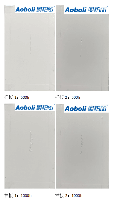 溫特實業奧柏麗環保無鉻卷材涂料經客戶使用后,反饋良好。下圖為生產線留樣樣板鹽霧實驗結果。結果顯示,500h鹽霧結果非常優異,劃線處極輕微起泡;800h鹽霧結果劃線處氣泡2S1;1000h鹽霧結果達到結束條件。