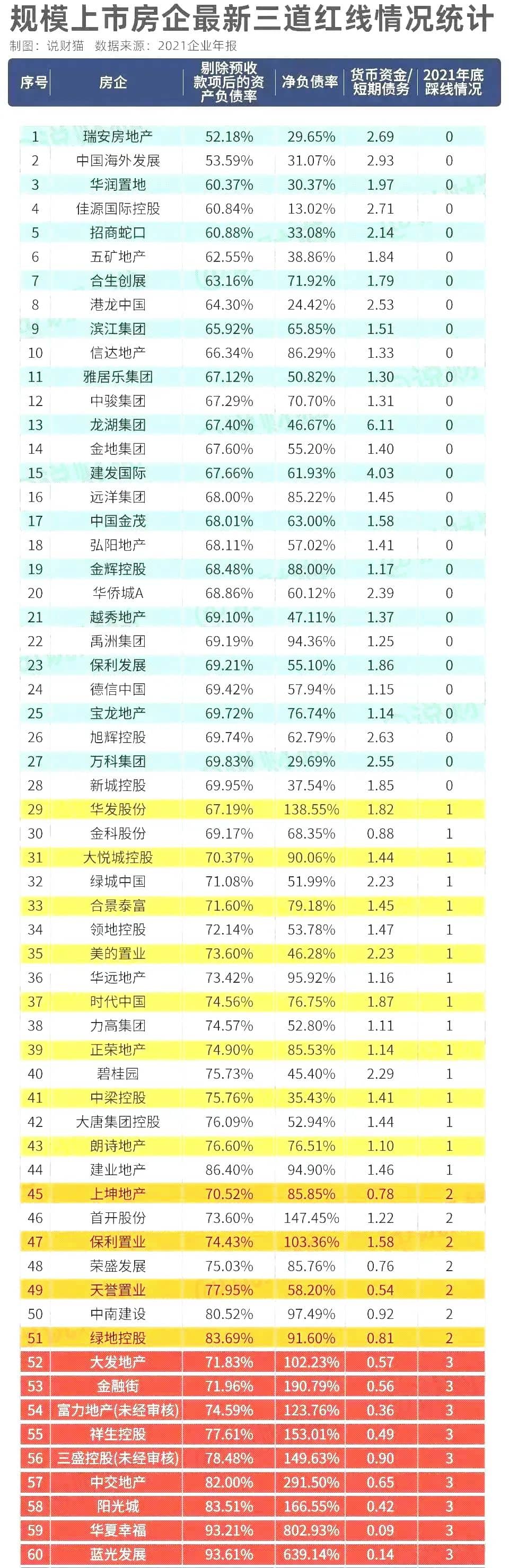 當前房地產市場迎來了全國全行業層面的嚴峻考驗,從TOP30房企拿地情況來看,今年一季度的銷售情況比2020年要差,預計二季度全國市場的表現也難以盡如人意。按照規模上市房企最新三道紅線情況統計,三道紅線全踩的“紅檔”房企占比為15%。祥生控股、陽光城、華夏幸福、藍光發展等多家企業已經連踩三條紅線,相當于被貼上了“危險”的警告標簽,一只腳已經站在懸崖邊上。
