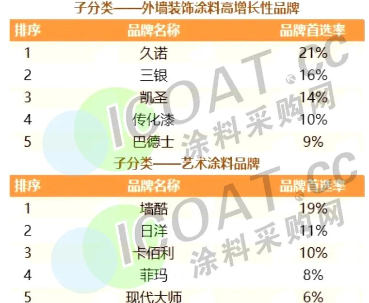 據一季度發布的“2022房地產開發企業綜合實力TOP500”、“TOP500房企首選供應商服務商品牌”等系列測評榜單可知,亞士漆、富思特、固克、德愛威、美涂士、巴德士、久諾、多樂士專業、華潤漆、經典等多個涂料品牌均被房地產行業認可和廣泛好評。地坪漆類、真石漆、多彩仿石漆、反射隔熱與絕熱涂料、水性涂料、外墻裝飾涂料、室內藝術涂料等多個子分類也覆蓋了墻酷、日洋、菲瑪、卡百利、現代大師、三銀、威士伯、傳化漆、宣偉、申紐力、飛鹿、華德隆、凱圣、傳化漆、斯蒙等多個知名涂料品牌。