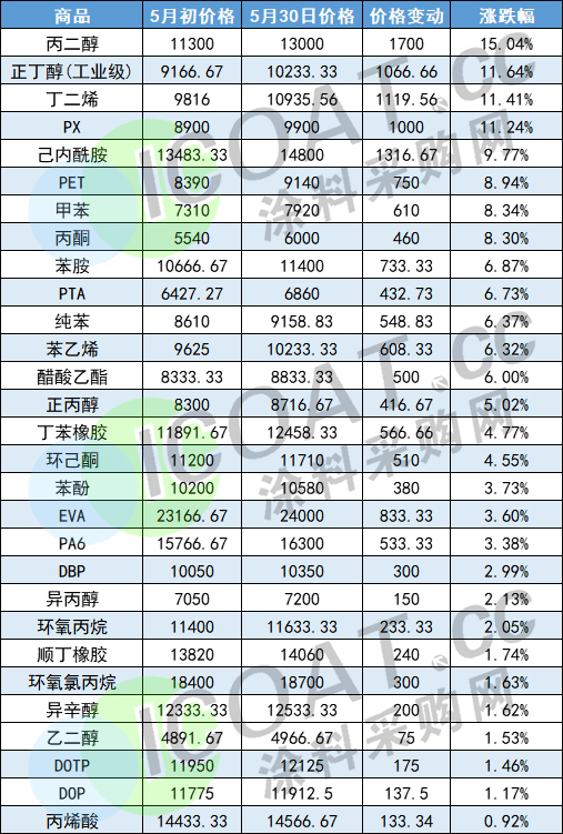 貨運方面的壓力正在日益加大,且正在向發貨端和收貨人等上下游產業鏈進行傳導。運費不斷上漲之下,產品的綜合成本提高,最終將通過產品價格調漲的方式進行,其中最為明顯的就是石油產業鏈上的化工品。據涂料采購網不完全統計,5月初至今,石油產業鏈上多種化工原料價格持續上揚,丙二醇、正丁醇、丁二烯、己內酰胺等化工品僅一個月的時間里噸價上漲超過1000元/噸。