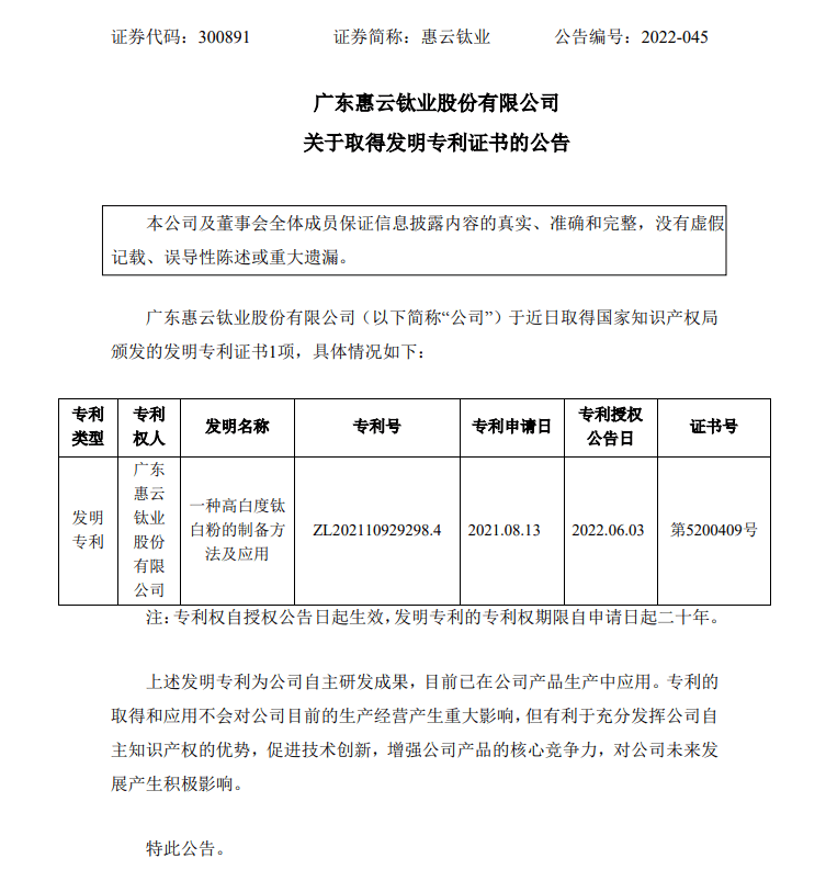 創新是企業的靈魂。一個企業的發展離不開科技的支撐。就在近日,惠云鈦業取得《一種高白度鈦白粉的制備方法及應用》的發明專利證書,這充分發揮了其自主知識產權的優勢,促進了鈦白粉技術升級創新,從而增強在行業的核心競爭力。