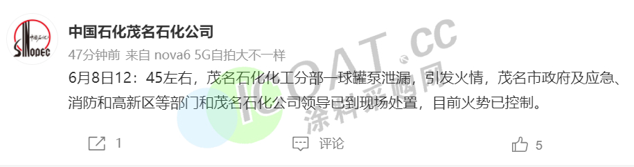 茂名石化化工分部一球罐泵泄漏,導致乙烯裂解裝置芳烴單元中間罐著火。此次故障涉及2#裂解裝置,目前25萬噸/年2#LDPE裝置已停車,開車時間待定。