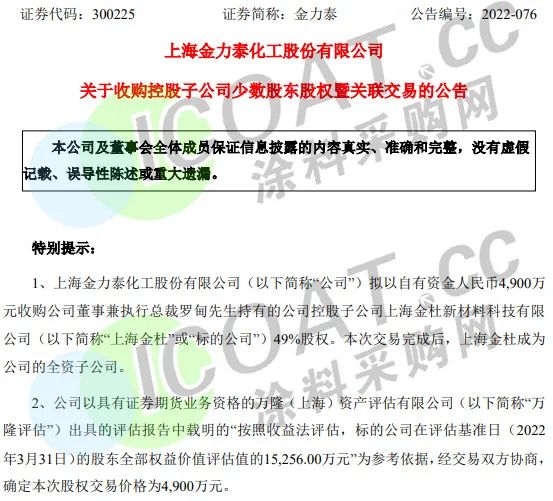6月9日,金力泰披露,擬以自有資金4900萬元收購公司董事兼執行總裁羅甸持有的公司控股子公司上海金杜49%股權。本次交易完成后,上海金杜成為金力泰的全資子公司。