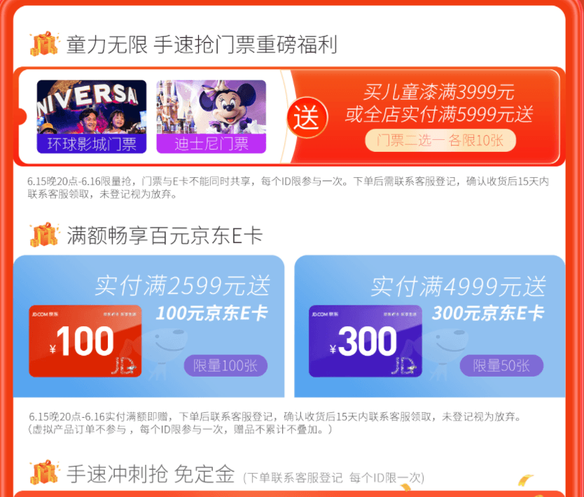 推出買兒童漆滿3999元或全店實付5999元送環球影城門票/迪士尼門票、實付滿2599元送100元京東E卡、實付滿4999元送300元京東E卡優惠活動(限量)。預售前100名享免定金特權,原價599的抗甲醛凈味全效面漆5L秒殺價199元(限量)。此外還有會員專享5元無門檻優惠券,多樂士會員儲值折上折等活動。