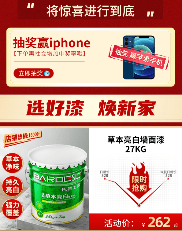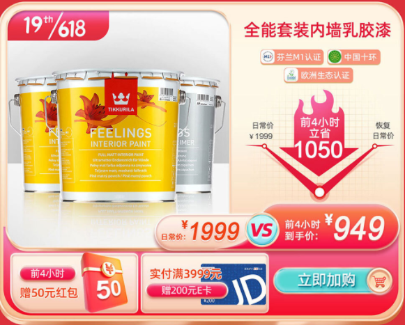 立邦涂料參與了淘寶618跨店滿減活動,每滿300元減50元(上不封頂),并推出了“618狂歡日福利”,到店滿額贏萬元免單,滿額送裝修紅包,會員5折秒殺,以及玩轉盤贏499禮盒等活動。除此之外,還實打實的對部分商品進行了立減50-150元的優惠,