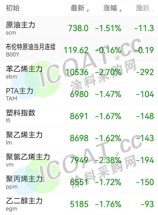 下游疲軟,市場頹廢,再加上國際因素推動,近期原油也開始小幅下滑,化工期貨市場開始不斷飄綠。據統計,從6月9日開始化工期貨不斷呈現出“大滑坡”態勢,聚丙烯、塑料、PVC均已連續下跌8天(關聯閱讀:油價大跌!樹脂、鈦白粉50多種化工原料下跌!)。