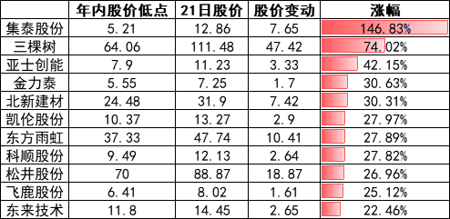 另據涂料采購網了解,21日,以防水涂料和建材涂料領域為代表的多家上市公司集體飆紅。21日,集泰股份股價較年內股價低點上漲7.65元,漲幅146.83%;三棵樹股價較年內低點上漲47.42元,漲幅74.02%;亞士創能、金力泰、北新建材等股價較年內低點上漲在20%——40%之間。