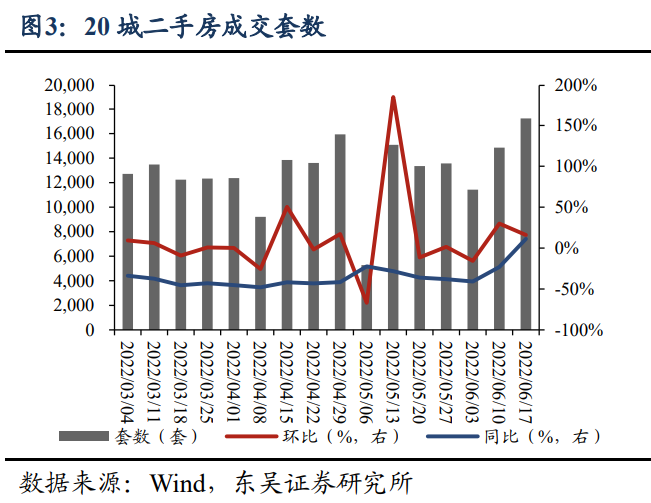 地產板塊股市的紅火是否也反應出了現貨市場的火爆呢?讓我們一起來看一看。房地產市場,上周(2022.6.13-2022.6.19)60城新房成交面積515.9萬平,環比+36.9%,20城二手房成交面積155.9萬平,環比+14.8%,同比+3.6%;16城新房累計庫存10209.9萬平,同比+9.6%。16城新房累計庫存10218.9萬平,環比基本持平,同比+8.5%。