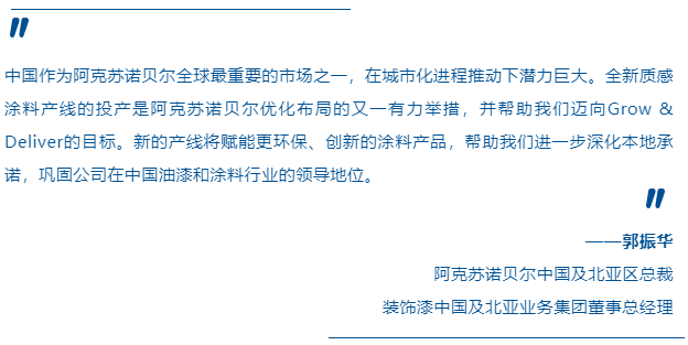 阿克蘇諾貝爾中國及北亞區總裁、裝飾漆中國及北亞業務集團董事總經理郭振華曾表示,盡管新冠疫情帶來了很大的挑戰,阿克蘇諾貝爾仍然持續致力于用自己的力量幫助建設一個更健康可持續的地球。公司在中國的四大裝飾漆工廠都已經轉型升級生產水性漆。