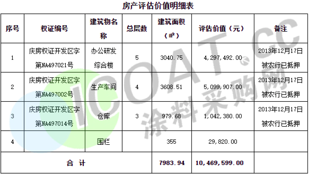 1.房屋建筑及構(gòu)筑物:房屋建筑物及構(gòu)筑物共計4處,占地面積7983.94平方米,其中3處房產(chǎn)已抵押,評估價值為10,469,599.00元。