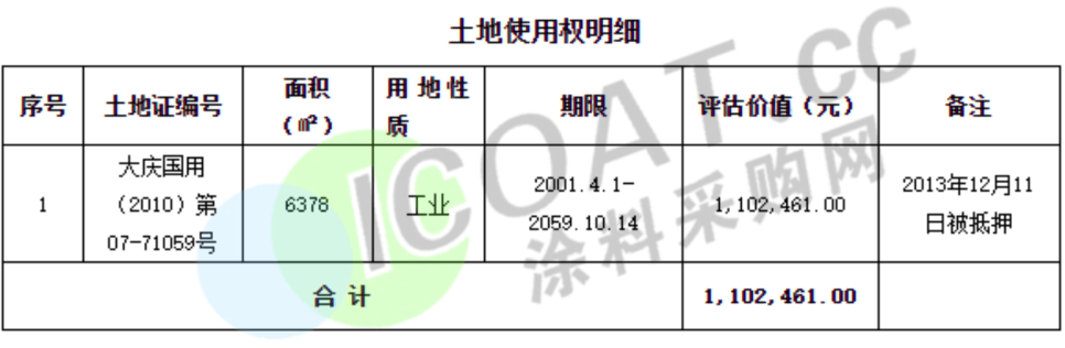 2.土地使用權(quán):土地面積6378平方米,已抵押,評估價值為1,102,461.00元;