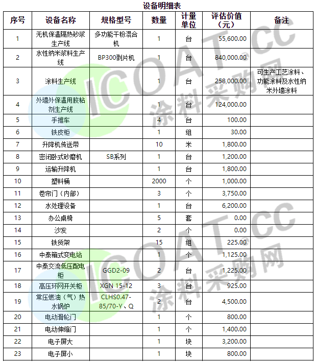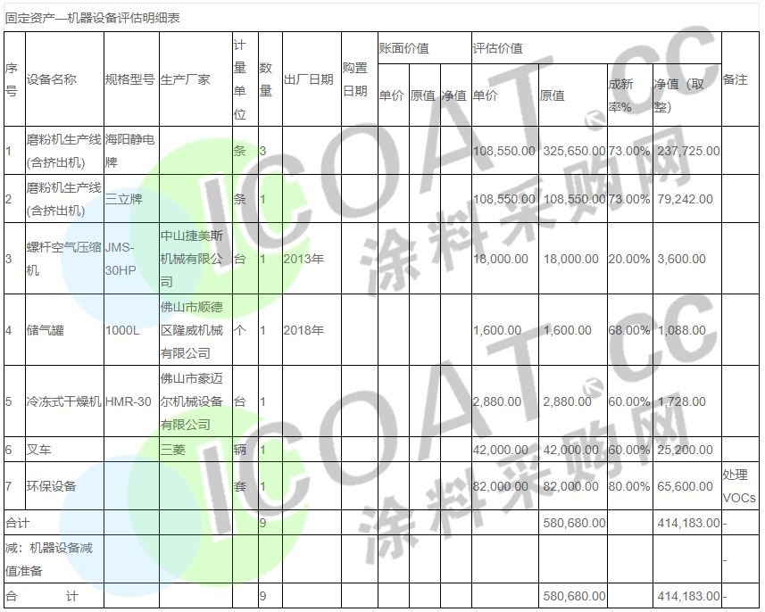 變賣標的物:佛山市光興粉末涂料有限公司所有的機器設(shè)備一批(具體名稱、數(shù)量、規(guī)格型號等詳見標的物介紹),現(xiàn)存放于佛山市三水區(qū)云東海街道興業(yè)路4號首層之二廠房佛山市光興粉末涂料有限公司內(nèi)。