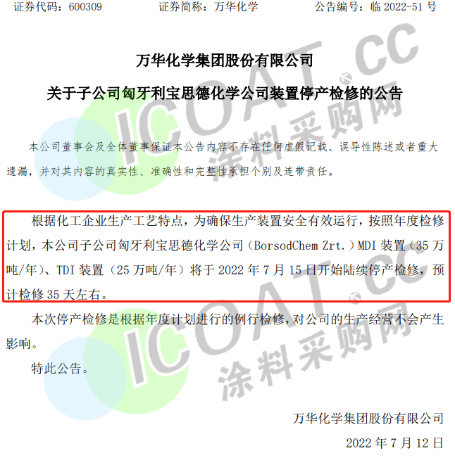 近日,萬華化學發布子公司裝置停產檢修的公告,稱按照年度檢修計劃,子公司匈牙利寶思德化學公司MDI裝置(35萬噸/年)、TDI裝置(25萬噸/年)將于2022年7月15日開始陸續停產檢修,預計檢修35天左右。