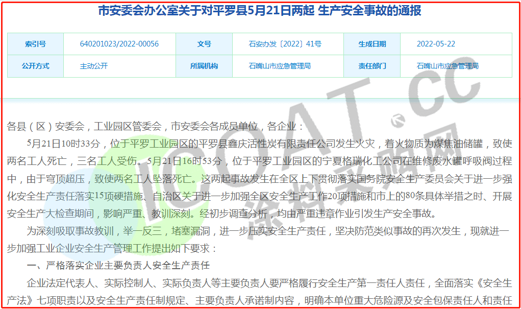 5月21日,寧夏石嘴山平羅縣平羅工業園區的平羅縣鑫慶活性炭有限責任公司發生火災,著火物質為煤焦油儲罐,致使2名工人死亡,3名工人受傷。經初步調查分析,事故由嚴重違章作業引發。