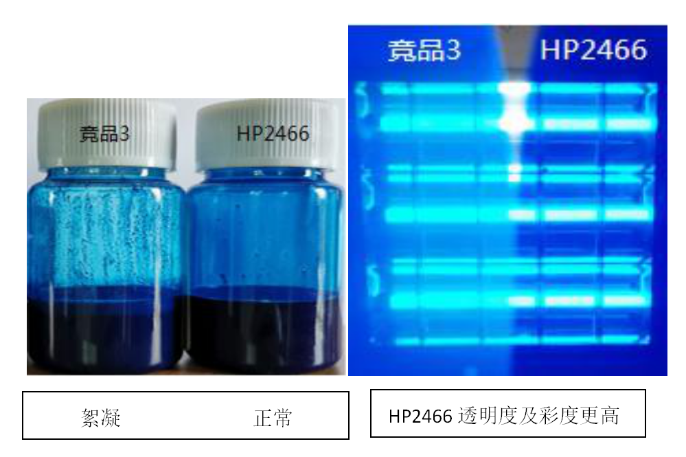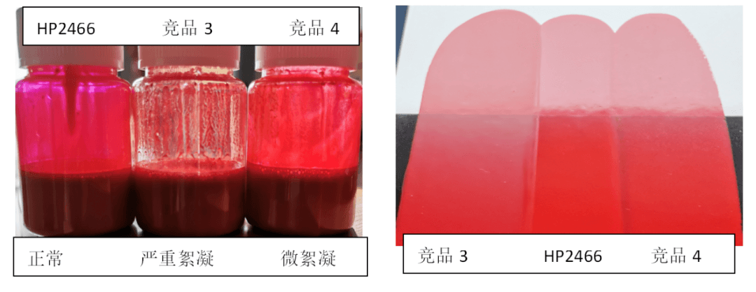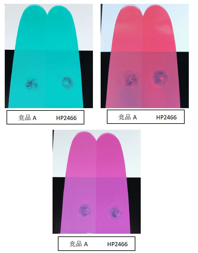 從板面可以對(duì)比看出,HP2466具有較好的抗浮色發(fā)花的效果,且對(duì)顏色具有較好的展色效果。