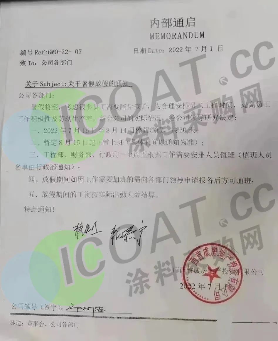 廣東某企業通知,由于受疫情影響,全國房地產及建材行業銷售不理想,訂單銳減,企業結合實際經營情況,對職能及營銷崗位的相關崗位人員,自2022年7月10日至10月9日停工放假。