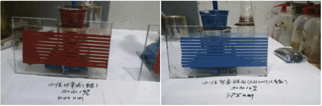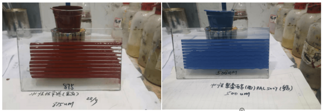 涂料采購網在與南方漆業研發人員進行技術交流時獲悉,將水性環氧底漆加入水性環氧云鐵中間漆以及水性聚氨酯面漆,經過涂裝、靜置后觀察,可以對比得出,不同型號都具備優異的抗流掛性效果,極大地提升了涂裝系統的施工性。
