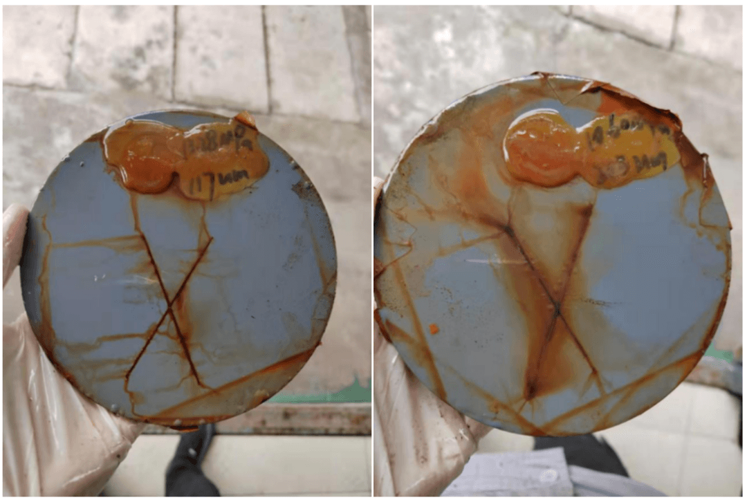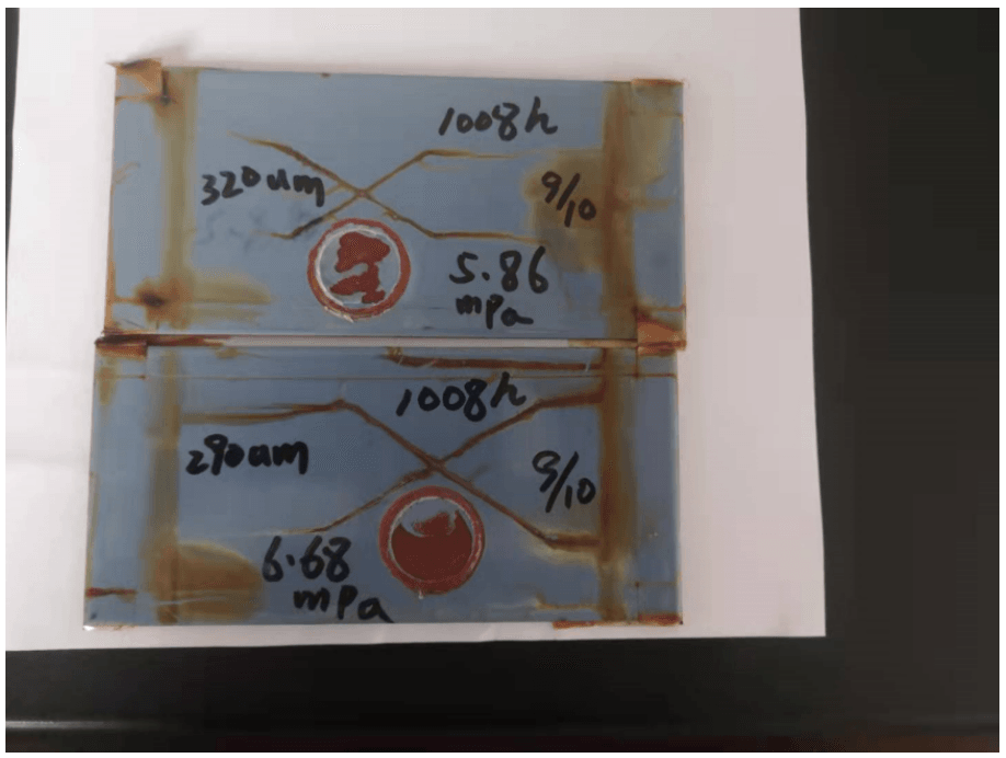 據實驗顯示,該專利發明具備優異的耐鹽霧性,跟線噴板測試鹽霧已達1842h,實驗過后漆膜無起泡、無脫落、無銹蝕。不僅擁有良好的耐化學品、耐溶劑、耐水、耐鹽水性,還能保持優良的耐久性和防腐蝕性能。