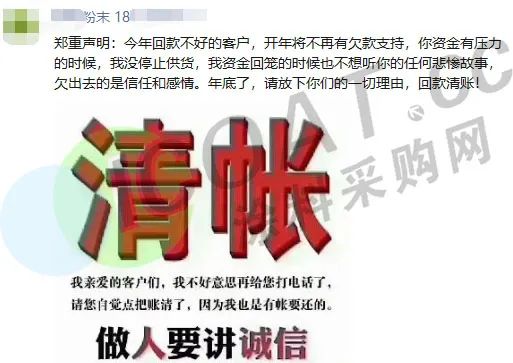 近日,某粉末涂料廠在社交平臺(tái)宣布,月底請(qǐng)各位老板安排一下貨款,未按期付款的恕不能繼續(xù)供貨。