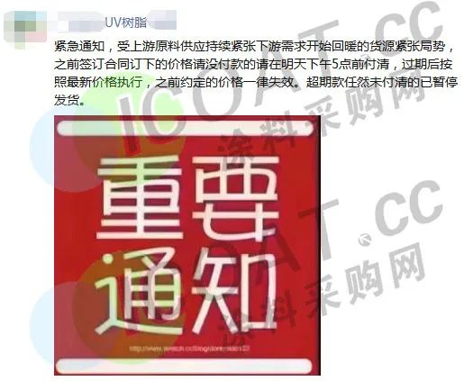 某UV樹(shù)脂企業(yè)表示,受上游原料供應(yīng)持續(xù)緊張和下游需求開(kāi)始回暖的貨源緊張態(tài)勢(shì),之前簽訂合同定下的價(jià)格,沒(méi)付款的請(qǐng)?jiān)诖稳障挛?點(diǎn)前付清,過(guò)期后按最新價(jià)格執(zhí)行,之前約定的價(jià)格一律失效,超期仍然未付清的已暫停發(fā)貨。