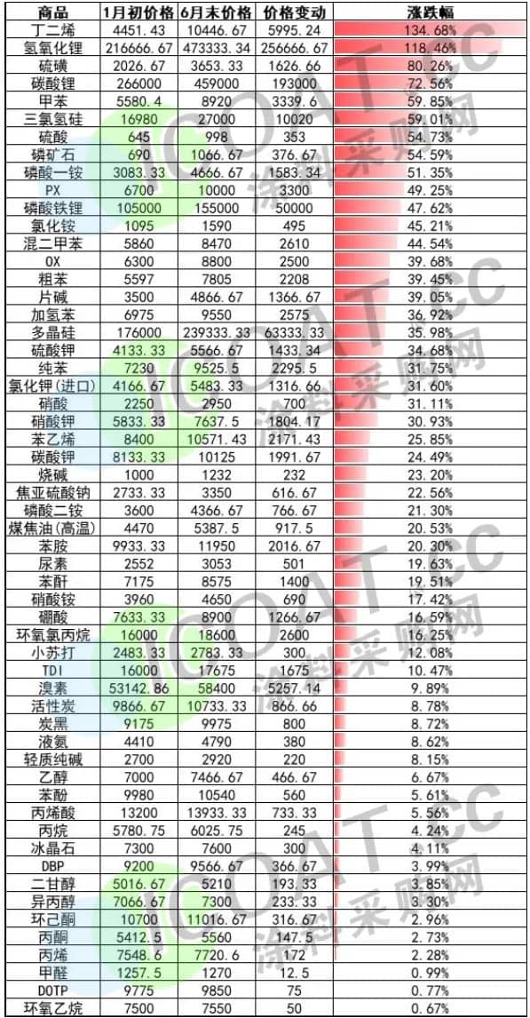 2022上半年部分化工品漲幅榜