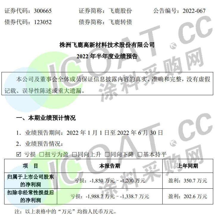 飛鹿股份:預計2022年上半年歸屬于上市公司股東的凈利潤虧損1200萬元~1850萬元,由盈轉虧,上年同期盈利350.7萬元;扣除非經常性損益后的凈利潤虧損1988.7萬元-1338.7萬元,上年同期盈利202.6萬元。