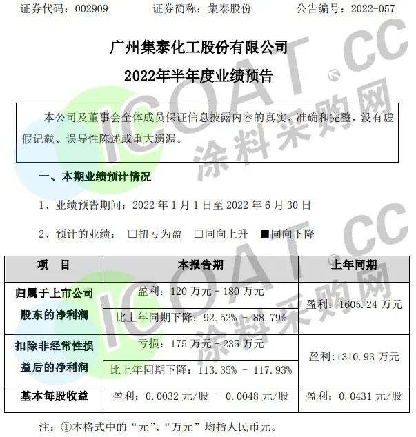集泰股份:預計2022年上半年歸屬于上市公司股東的凈利潤120萬元~180萬元,同比下降88.79%~92.52%;基本每股收益0.0032元~0.0048元。