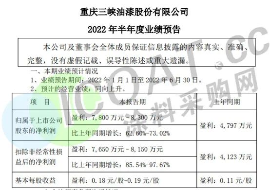 重慶三峽油漆股份有限公司:預計2022年上半年半年度歸母凈利7800萬元-8300萬元,同比增長62.60%-73.02%。