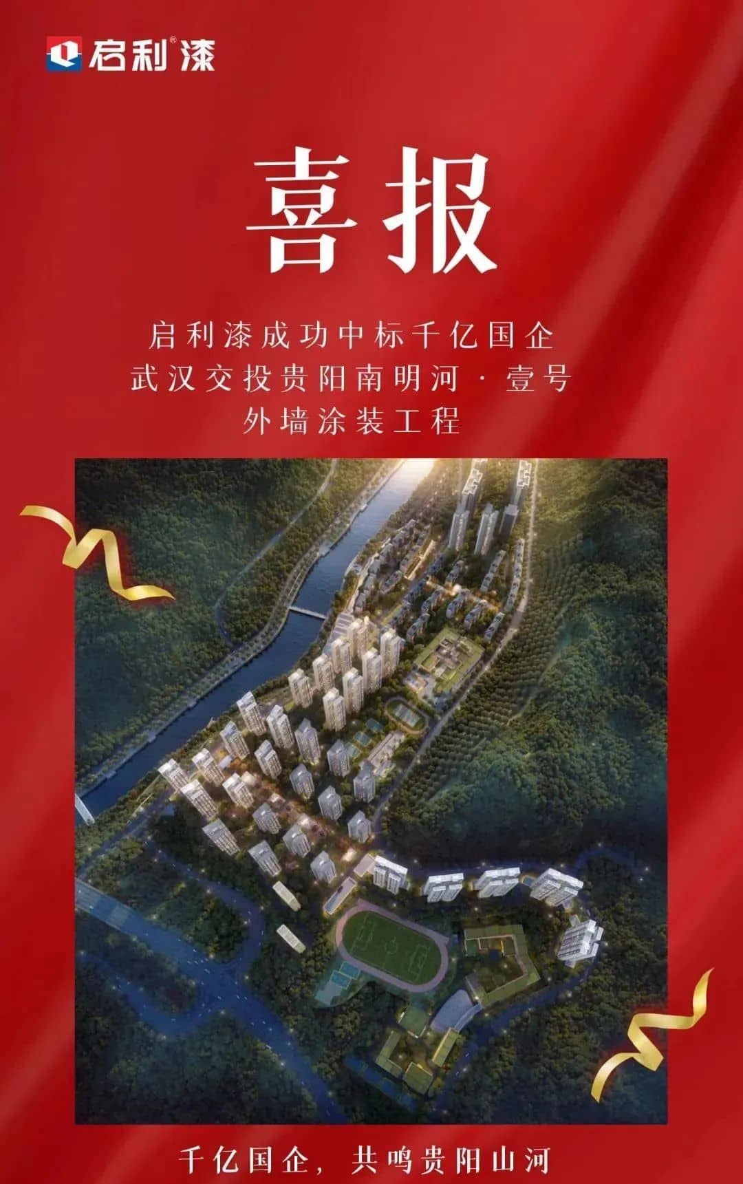 啟利漆成功攜手綠地控股旗下貴州建工集團助力千億國企武漢交投貴陽南明河·壹號外墻涂裝工程,外墻立面采用啟利質感涂料系列產品,總建筑面積超110萬方。